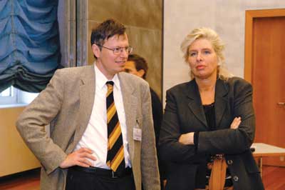 Dr. Christa Wirthumer-Hoche, hier im Gespräch mit dem wissenschaftlichen Tagungsleiter Professor Dr. Werner Aberer, überbrachte den Tagungsteilnehmern in Vertretung von Ministerin Maria Rauch-Kallat Grüße vom österreichischen Bundesministerium für Gesundheit und Frauen.