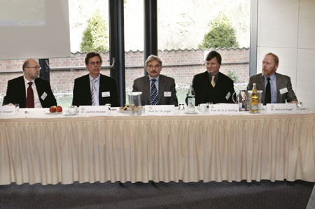 Bei einer Pressekonferenz der GD anlässlich der 10. GD-Jahrestagung am 4. und 5. April 2006 in Münster stellte der stellvertretende Leiter der GD-Fachgruppe „Sicherheitsbewertung und Verkehrsfähigkeit“, Dr. Richard Vogel vom Bundesinstitut für Risikobewertung (BfR) in Berlin (rechts), eine von der Fachgruppe erarbeitete Stellungnahme zur Sicherheitsbewertung von Chemikalien in Europa vor. Mit am Podium (von links): Professor Dr. Thomas L. Diepgen, Sprecher der GD Task Force „Licht.Hautkrebs.Prävention“, Dr. Joachim Kresken, Vorsitzender der GD, Professor Dr. Thomas Luger, wissenschaftlicher Tagungsleiter, und Prof. Dr. Hans Christian Korting, stellvertretender GD-Vorsitzender.