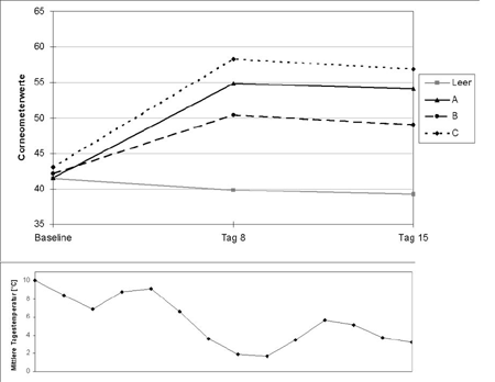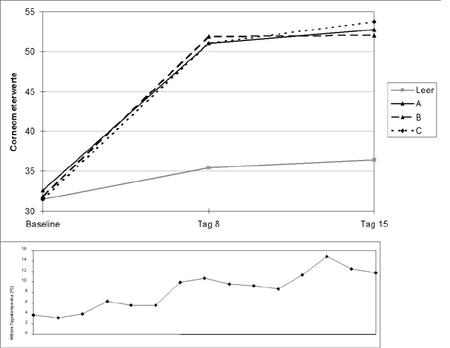 Zur Vergleichbarkeit der gemessenen Werte bleibt das Mitführen einer unbehandelten Kontrolle wesentliche Voraussetzung, manchmal ist auch die Einbeziehung von Referenzprodukten sinnvoll. Außerdem ist es möglich, die Klimaabhängigkeit der Hautfeuchtigkeit in die Bewertung miteinzubeziehen. Abbildung 3 zeigt ein Beispiel für diese Klimaabhängigkeit. In der Abbildung ist die Hautfeuchtigkeit über eine Zeit von 14 Tagen bei ansteigender Außentemperatur (gezeigt im unteren Teil der Grafik) dargestellt. Drei verschiedene hautbefeuchtende Mittel (A, B, C) wurden gegen "unbehandelt" getestet. Die obere Grafik zeigt die Corneometerwerte während dieses Zeitraums. Man erkennt einen deutlichen Anstieg in behandelten Feldern und einen leichten Anstieg im unbehandelten Feld. Dieser Anstieg im unbehandelten Feld entsteht in Abhängigkeit von dem Anstieg der Außentemperatur im gleichen Zeitraum. Diese Zunahme der Hautfeuchtigkeit in Abhängigkeit von der Außentemperatur muß auch für die Testformulierungen berücksichtigt werden. Abbildung 3: Klimaabhängigkeit der Hautfeuchtigkeit, ansteigende Außentemperatur A, B, C = Behandlung mit Präparat A, B, C Leer = Unbehandelt