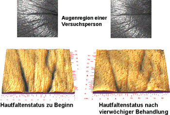 Nach den ermutigenden biochemischen Ergebnissen zur Collagen- und GAG-Stimulierung durch die Cytokin-Creme stellt sich - insbesondere aus Sicht des Verbrauchers - die entscheidende Frage, ob diese biologische Wirksamkeit auch zu einer Faltenreduktion führt. In einer kontrollierten Gebrauchsstudie benutzten 30 Probanden die Cytokin-Creme über 4 Wochen. Zu Beginn der Studie und am Ende wurde mittels FOITS (Fast Optical In-vivo Topography of the Skin) der Faltenstatus quantitativ bestimmt. Die Faltentiefe (Rauhigkeitstiefe Rz) nahm im Mittel um 16 % ab. Die einzelnen topographischen Aufnahmen zeigen deutlich die Abflachung der tiefen Falten im kritischen Augenwinkelbereich (Abb. 7).